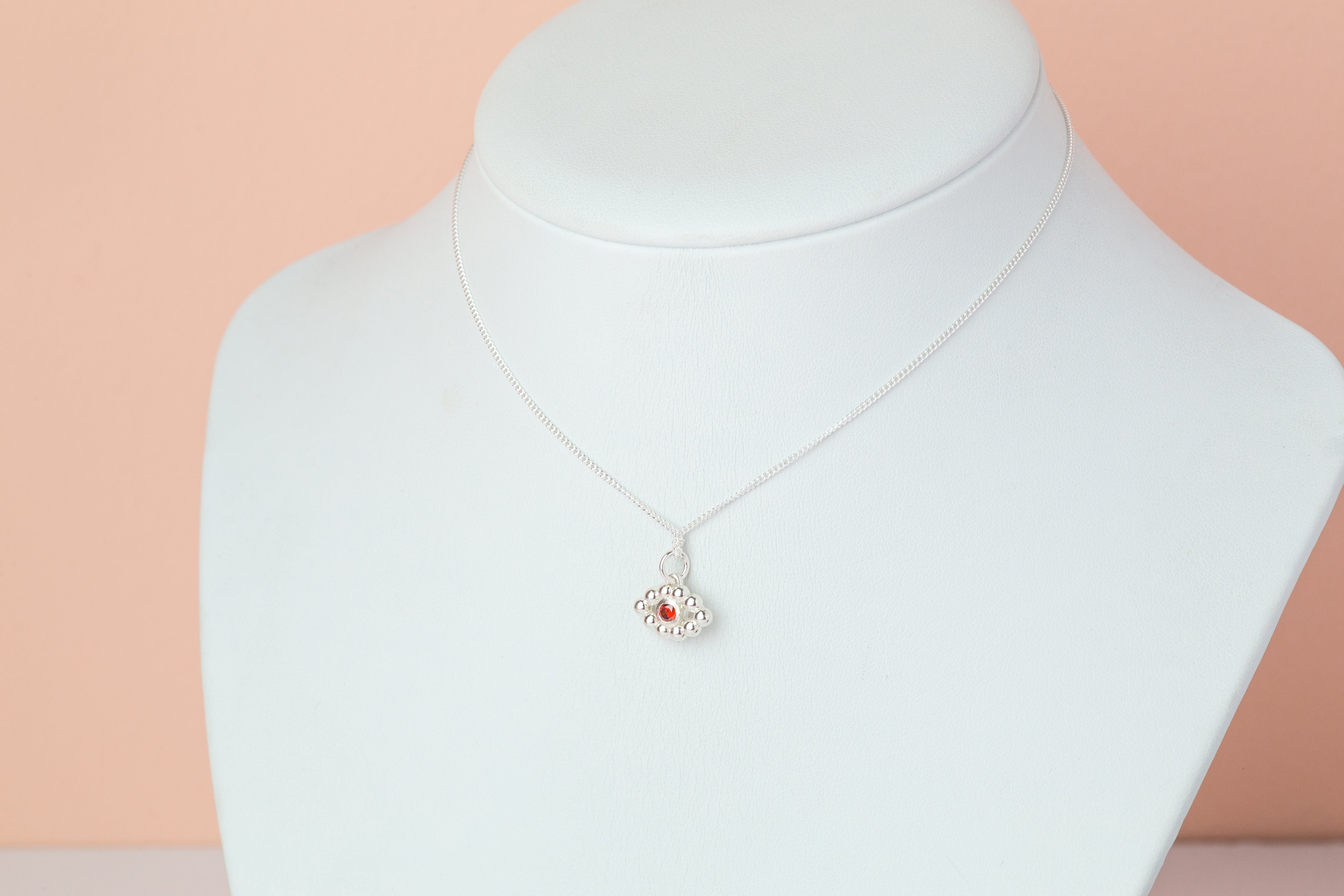 The eye's centre is set with a brilliant ruby cubic zirconia gemstone, which offers a striking pop of colour and shine.